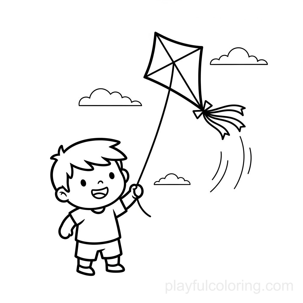 طفل يطير طائرة ورقية بشرائط ذيل بسيطة وخطوط نسيم خفيفة.