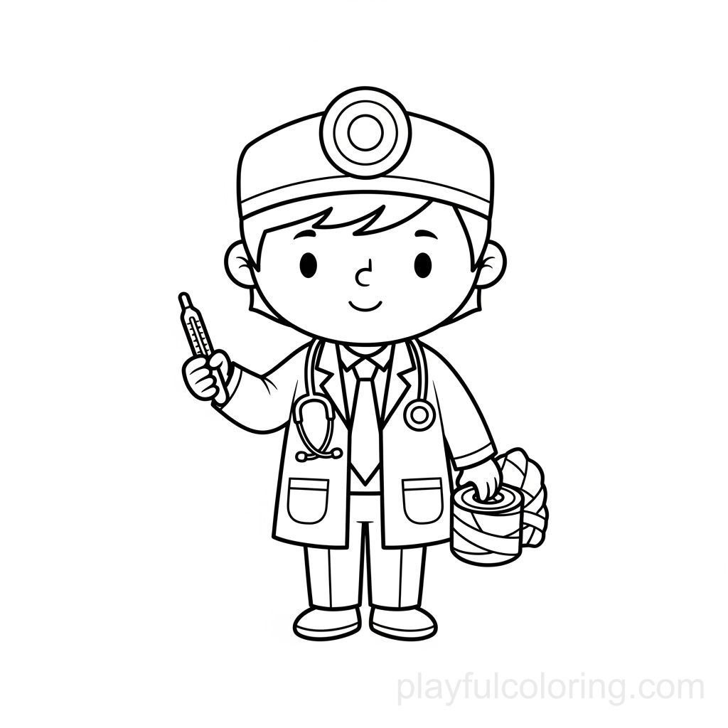 طبيب يحمل مقياس حرارة ولفافة ضمادات ووضعية هادئة ووسطه هادئ. – Coloring Pages | Playful Coloring
