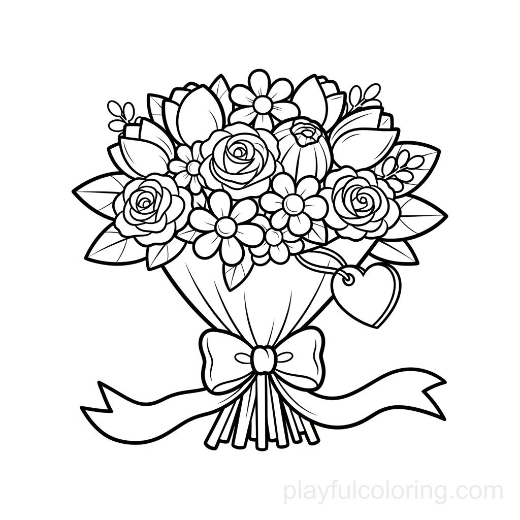 Un bouquet de fleurs avec un coeur 'MOM' (texte omis), un ruban, centré, des courbes sympathiques.