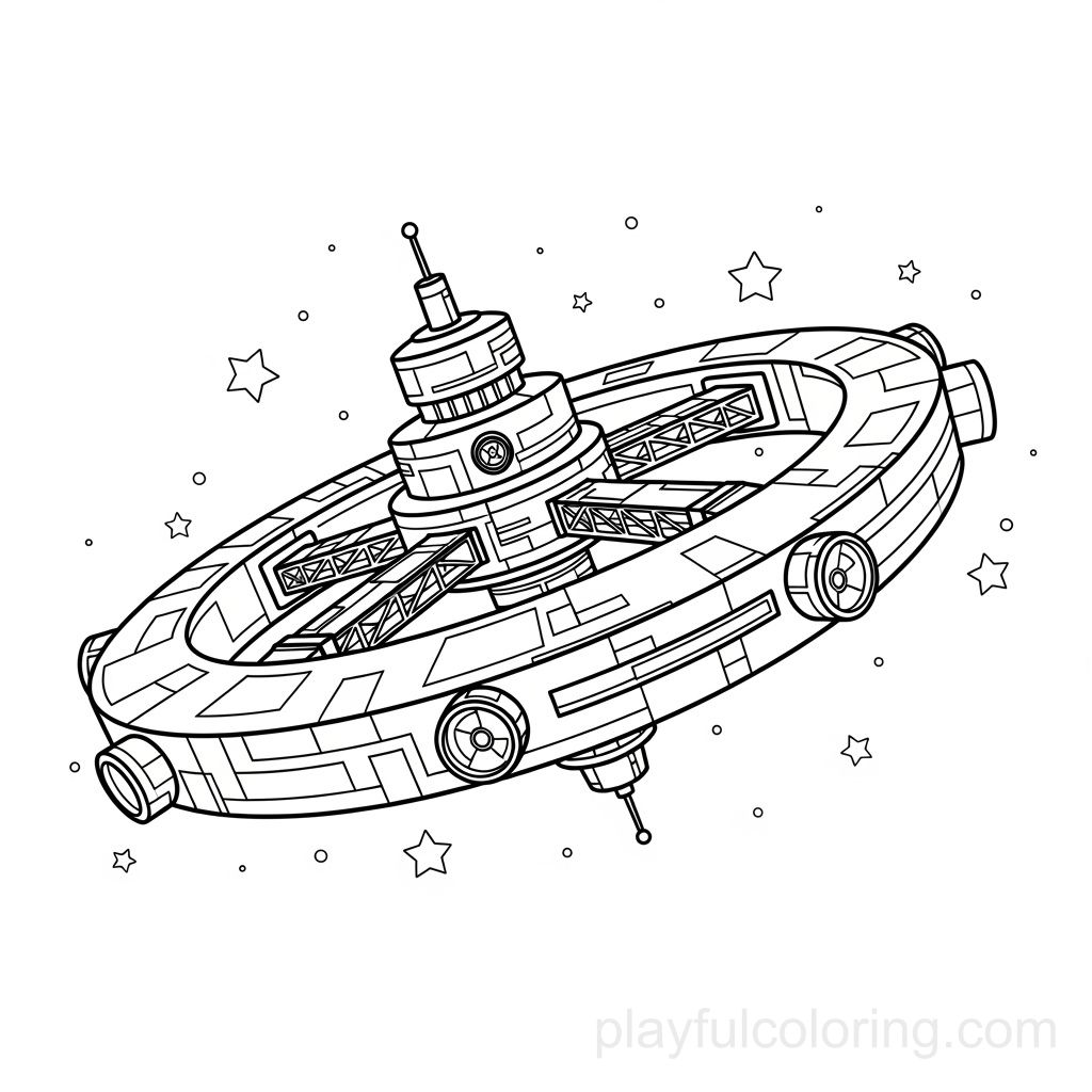 Космическая станция с кольцом и стыковочными портами, звезды вокруг.