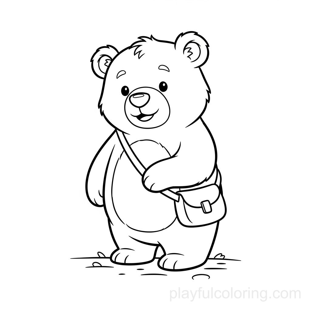 一只背着小书包的小熊,带着友好的微笑,摆出温和的姿势,隐约露出地面的痕迹。