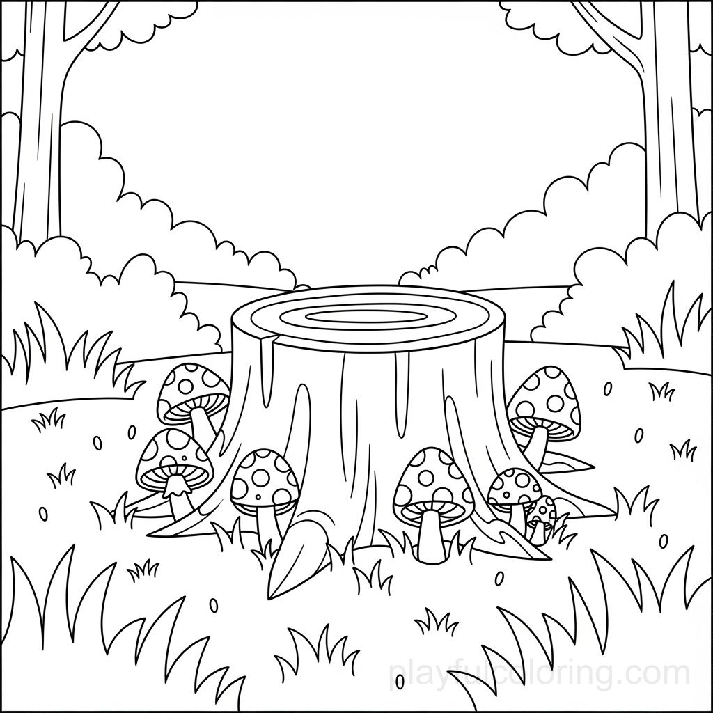 一片林间空地,有树桩、蘑菇和草丛。 – Coloring Pages | Playful Coloring