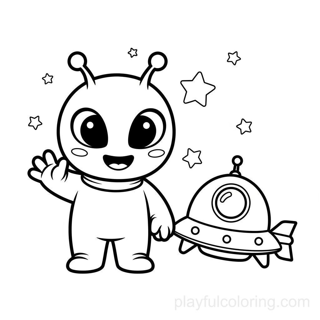一个友好的外星人在一艘有星星的小飞船旁挥手。