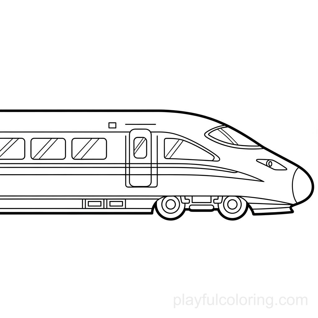 高速列车侧视图,流线型车头,车窗条纹,圆形车轮隐约可见,场景平静,轮廓清晰。