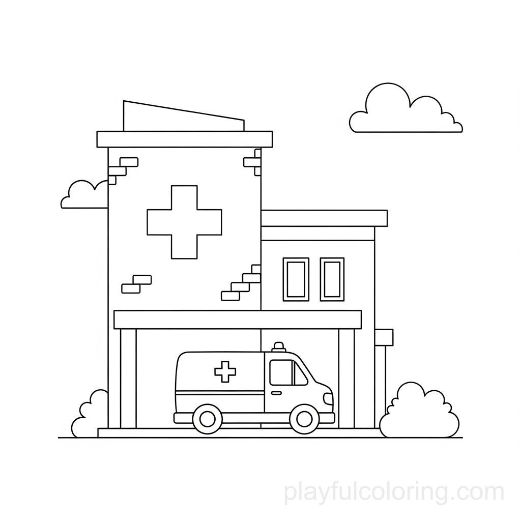 医院建筑的侧视图,带有救护车停放处的轮廓、十字架标志、平静的场景、友好的风格、简洁的线条。