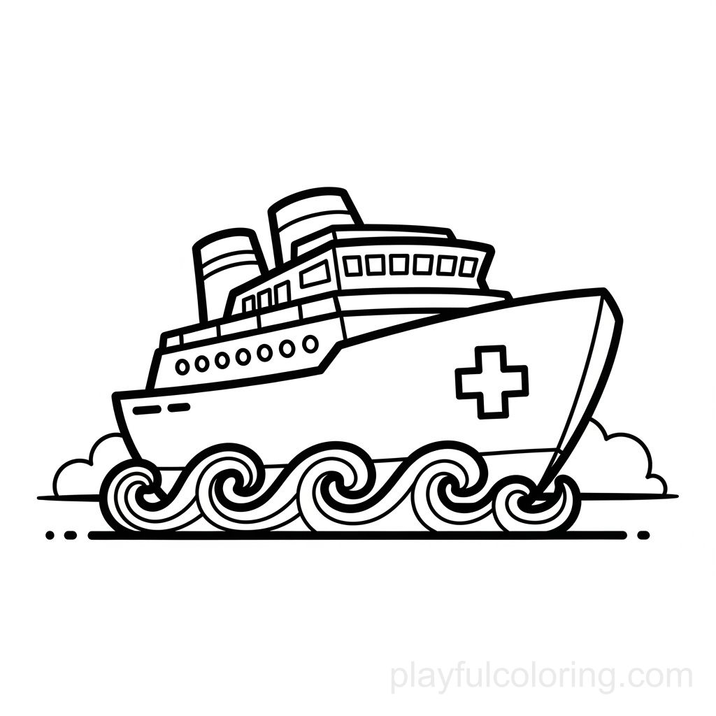 一艘医院船的侧视图,带有十字符号、圆形波浪、友好的形状、安全和中立。