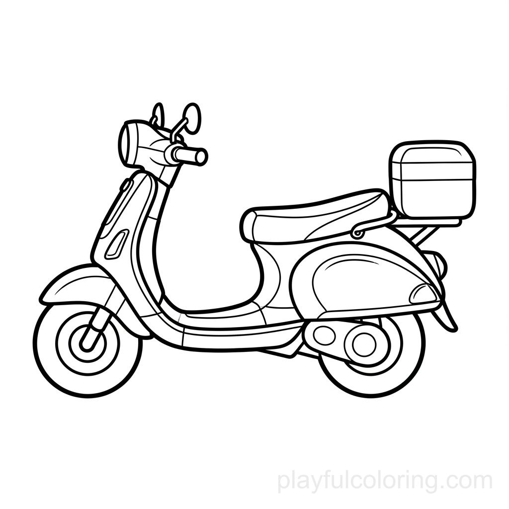 摩托车侧视图,后方小箱子轮廓,圆形车轮,亲切的比例,平静的场景。 – Coloring Pages | Playful Coloring