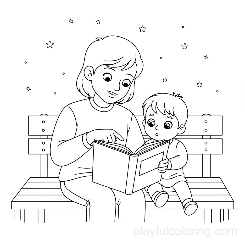 父母在长椅上给孩子读书,宁静的场景,点点繁星。