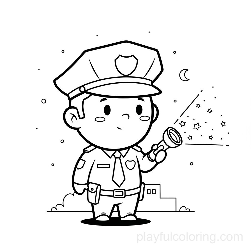 手持手电筒图标的警察,环顾四周,平静的场景,小星星,友好。