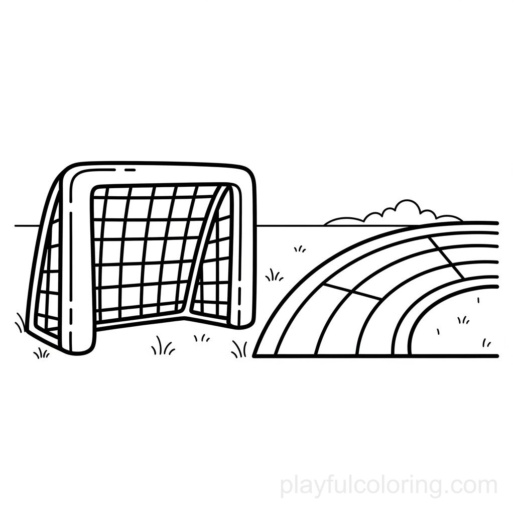 学校运动场图标:门柱和跑道弧线、友好的比例、平静的地平线、简洁的线条。