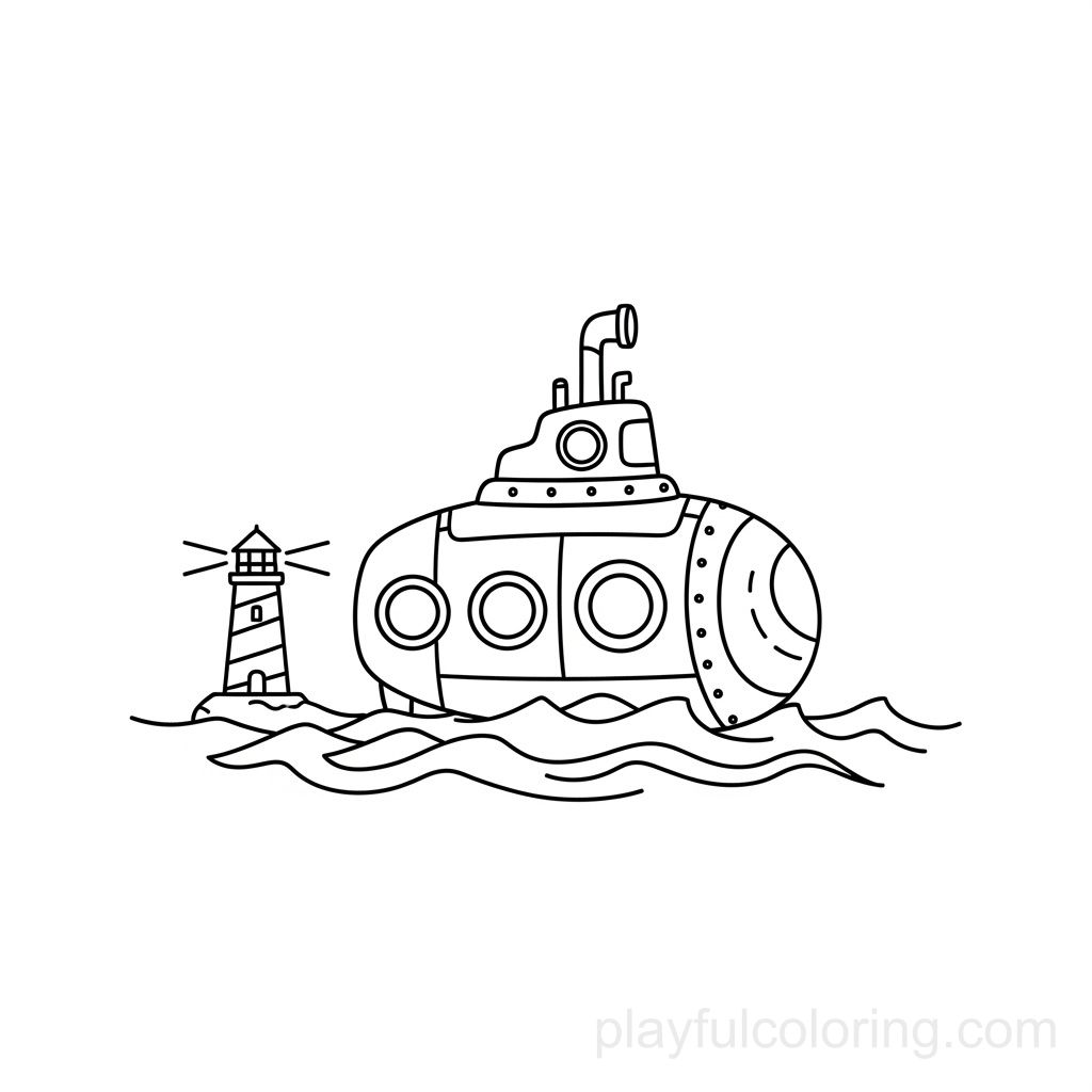 一艘潜艇靠近波浪上方的小灯塔图标,圆形窗户,平静的场景,友好的风格,简洁的轮廓。