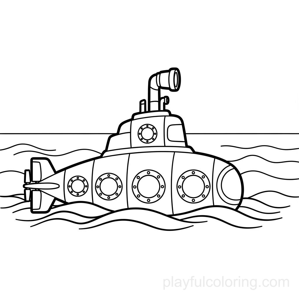 一艘潜艇,潜望镜上的图标位于波浪之上,圆形窗户,平静的地平线提示,友好的外观,居中。
