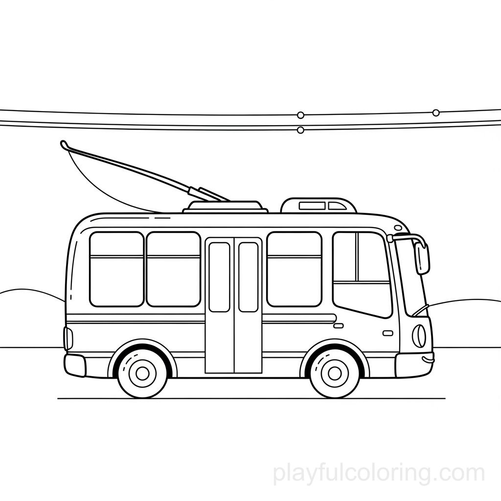 无轨电车侧视图,简单的杆线,圆形车轮,平静的地平线提示,友好的外观,简洁的轮廓。