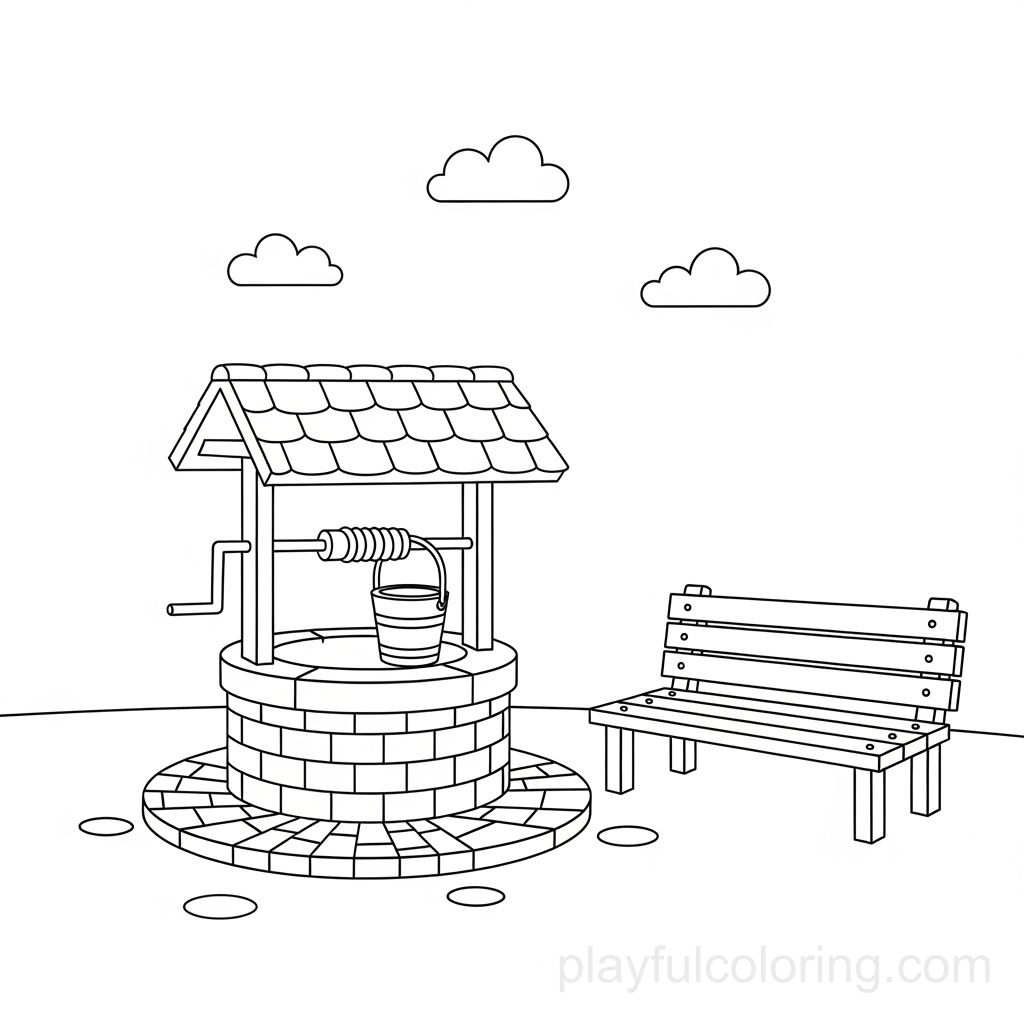 带有水井轮廓和长凳的村庄广场,小小的云朵,友好的场景。 – Coloring Pages | Playful Coloring