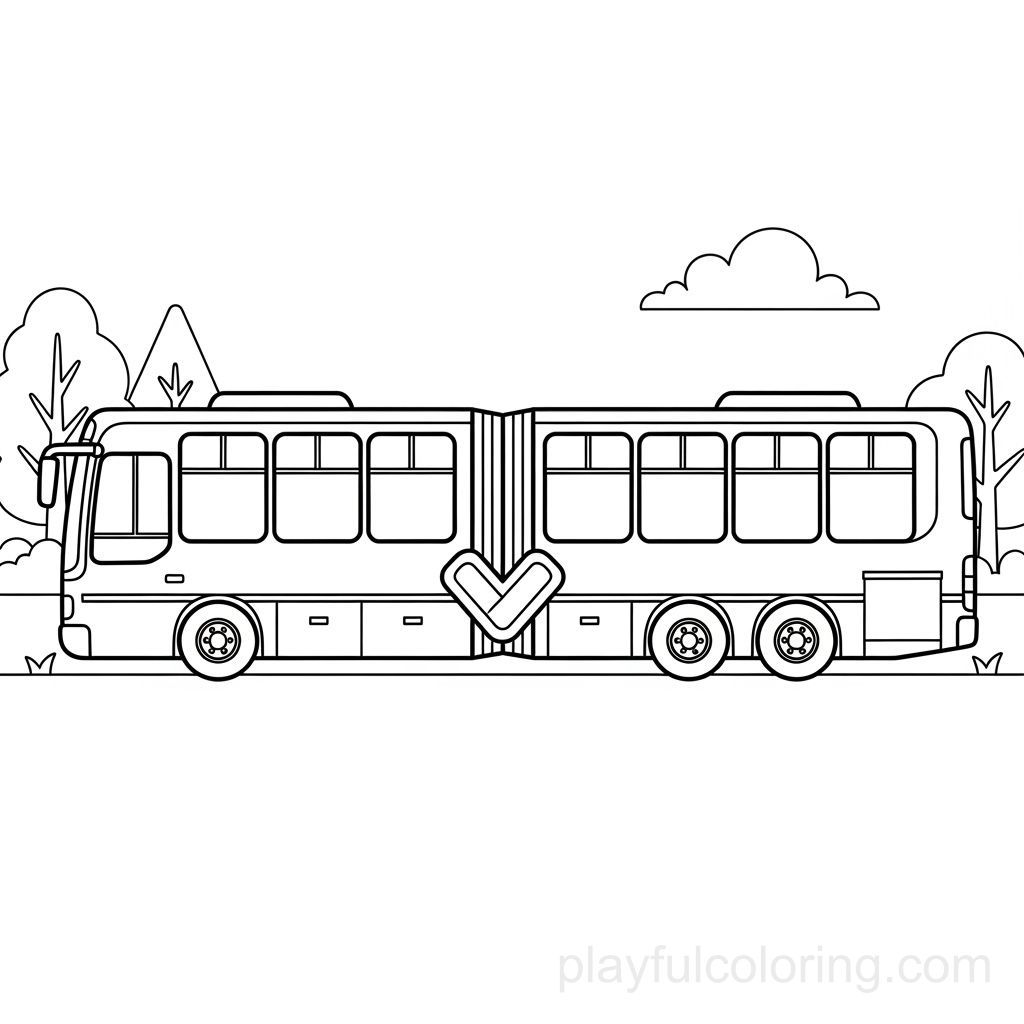 一辆铰接式公共汽车的侧视图,标有连接处,圆形车轮,长排车窗,场景平静。