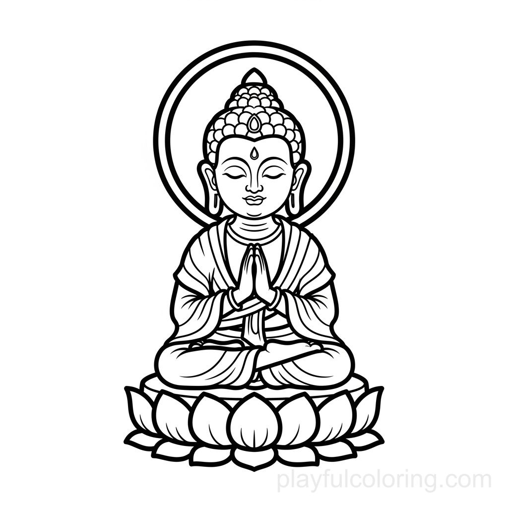 神像轮廓坐姿,双手作冥想状(禅定手势),莲花座,简单的光环,居中,安详而恭敬。